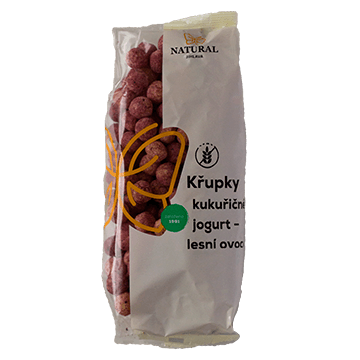Kukuřičné křupky v jogurtové polevě s příchutí lesního ovoce.